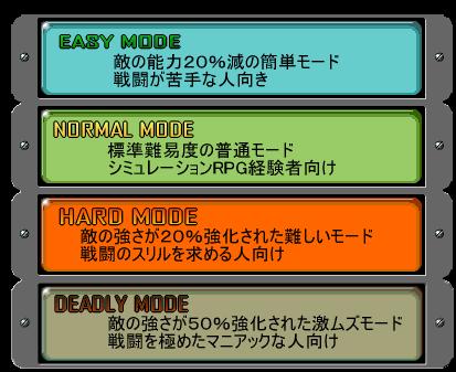 × [PR]上記の広告は3ヶ月以上新規記事投稿のないブログに表示されています。新しい記事を書く事で広告が消えます。 チャレンジモードで、10話でエラーが起きるのと、チャレンジ中に味方が死ぬと、死んだ奴に経験値が入って、生き残った奴に経験値が入らないというバグを修正しました ついでといっては何ですが、難易度を選べるようにしておきました ショップやフリーモードを選択して、インターミッションに戻ると、コマンドの中に追加されています 各概要は、以下の通りです。 ◎イージーモード 敵の能力値がむっちゃ下がるモード。 敵の攻撃は殆ど当たらないし、当たったとしても大したダメージにならない 私のゲームとしてはゆるい難易度の討伐記が、更にゆるーくなるモードです 戦闘が苦手な人や、『シミュレーションゲームは苦手だけど、ちょっと夜深達のシナリオに興味がある』とかいう人にオススメのモード。 ◎ノーマルモード 標準。 泣いても笑っても標準。 ちょっとゆるめの標準。 ◎ハードモード ちょっと敵の能力値が高いモード。 自分の攻撃が当たるか当たらないかでまずハラハラ。 更に、敵ターンでの敵の攻撃による、味方のダメージにハラハラ。 追い打ちのように、更に強くなったボスにヒーヒー。 本編でこのモードにすると、まさに私のゲームのスローガンである 『出来ない事はない』を体感する事が出来ます。 不可能ではないです。本当です。 こんなゆるい難易度物足りないぜ!って豪語する物好きさん用 ◎デットリーモード 敵がドーピングどころではない程強くなっているモード。 1週目の本編でこの難易度でクリアしようなんて、まず考えない方が良い とりあえず自分の攻撃が当たらない。当たらない。当たらない。 しかも回避できる確率が10%ってなんだこれ。 当たれば即死必至。だけど、ワンモアどころか敵にダメージ与えられるかどうかも危うい。 現段階では、完全にフリーモードのチャレンジモード用。 10話をクリア時に、1話をクリアできるかどうかも危ういってんだから、半端ではない難易度。 極Mの人向け PR