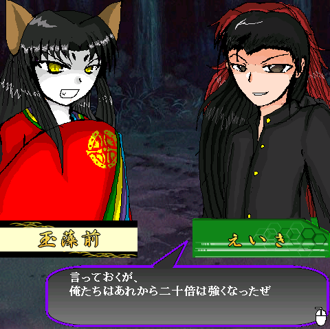 討伐記期待されてるのですねw割と続編待たれている人多いのですねw 今日、web拍手見てみると、匿名で続編を希望するコメが2個…w どうやら、昨日の日記で討伐記のどうこうの話をしたからのようです。 だって、誰もやってないと思ってたんだもんw ここ最近全然人気投票も票数増えてないし、感想もないしw ちうわけで、また話を更新していこうと思います。 前みたいな更新速度とはいかないと思いますが、フリーモードや東中無双で時間潰してちょw 【第8話 『喧嘩上等!』】 行方不明となった朝狐を探す夜深達の前に 驚異的な軍勢を連れたタマモノマエが急襲する。 絶望で顔を歪ませる夜深達だったが、そのタマモノマエの軍勢の前にたちはだかる者たちが…… それは、伝説の東中中学生徒、ミッチーとえいきだった 彼らの実力が、今明らかになる… 今回は前作『東中無双』の主要キャラである、ミッチー&えいき君が主役のおちゃらけシナリオです。 会話が多めに盛り込まれてはいるものの、ステージの難易度は塵に等しいと思って下さい だって2人ともめちゃんこ強いんだもん(笑) ただ、チャレンジモードでは条件2がちょっと鬼難易度。(詳しくは自分の目で確かめてみて下さい) 報酬金も普段より多くなっております。 現段階でこの条件2を攻略できたら凄いですw PR